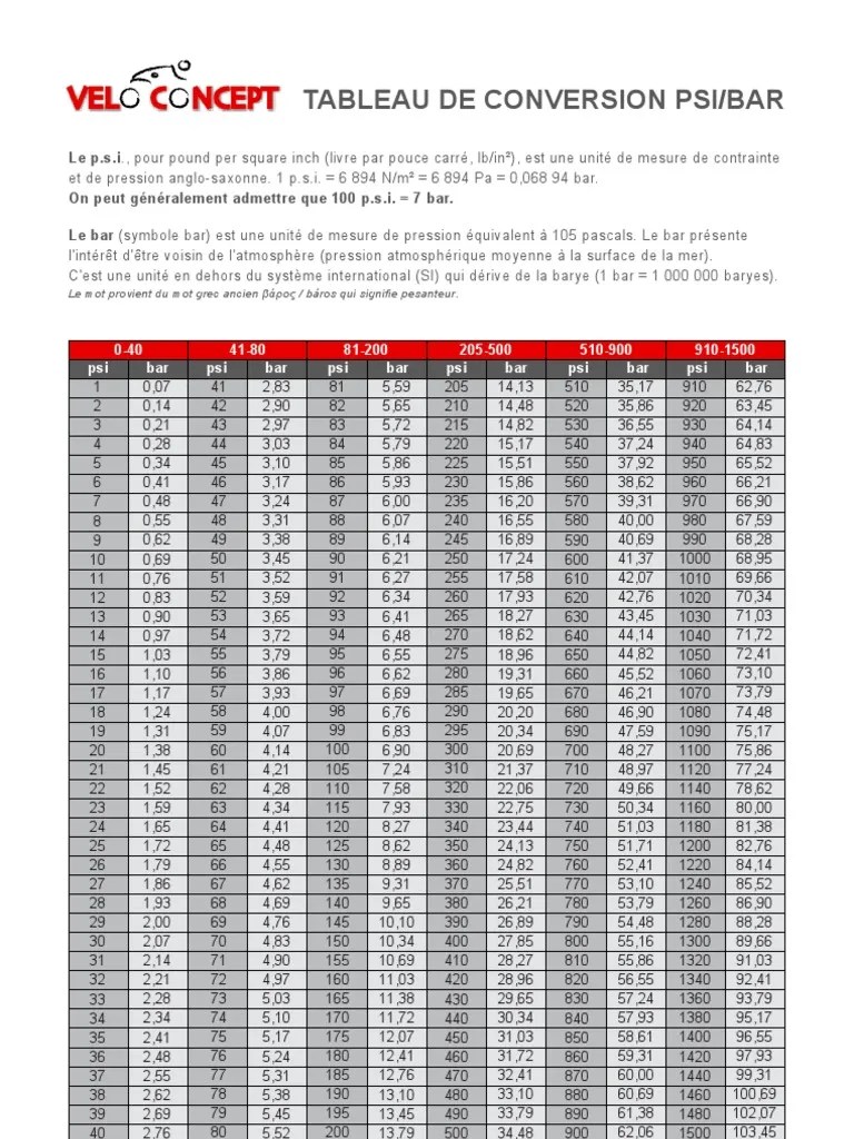 PRESSURE CONVERSION TABLE Bar, Pa, Kpa & Psi