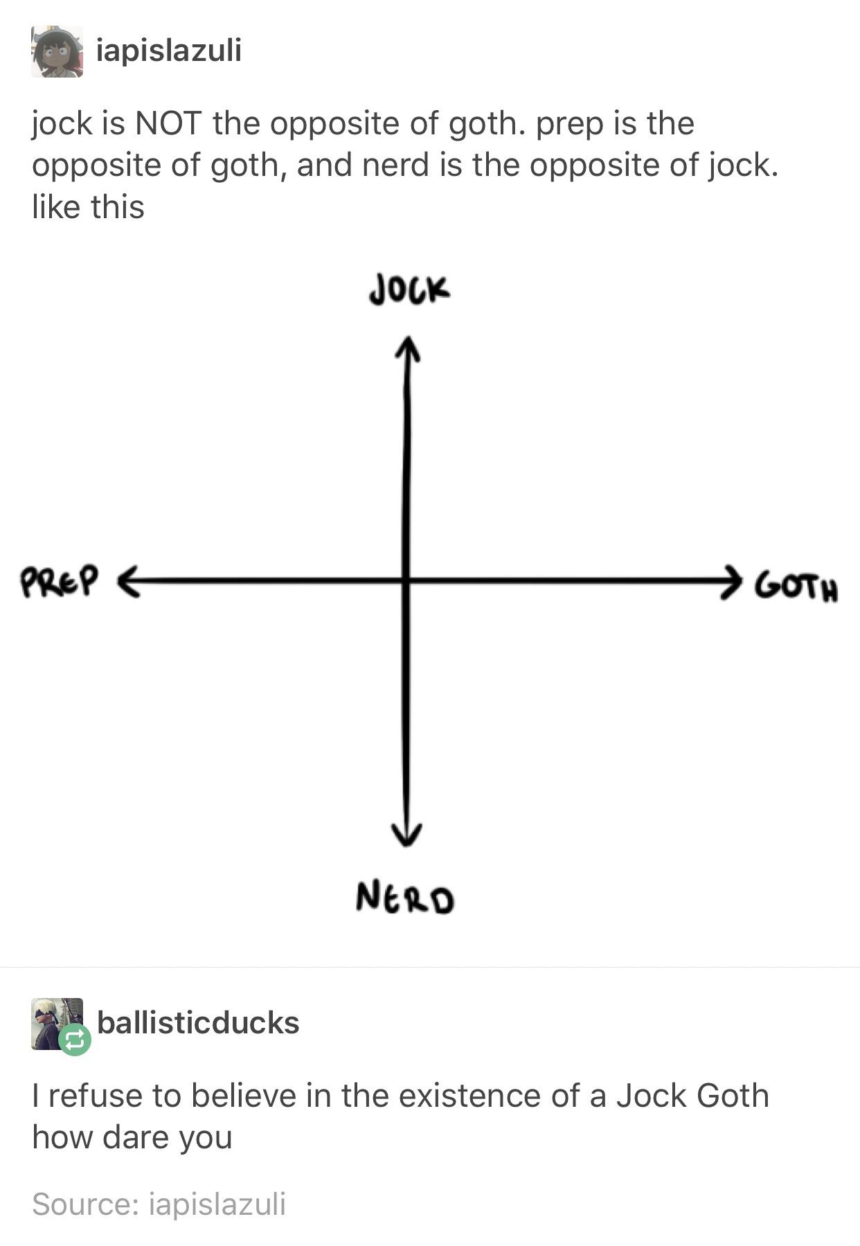 Jock Nerd Prep Goth Chart - Taking the jock, nerd, prep, and goth chart test is simple. You will find an accurate result. Web how to take jock, jock, nerd, prep, goth chart test. Like, i need you to take this quiz so we can know for sure. Go to the idrlabs website to take the test. Web are you more of a jock, nerd, prep, or goth? It is thought to have originated in 2017 and. Answer a few questions and discover who. Web are you a nerd, jock, goth, or prep?