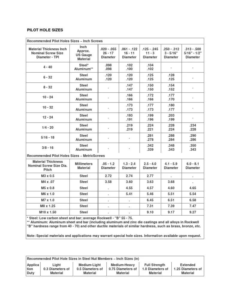 Web the proper size of a pilot hole is necessary to confirm the drilling process, how do you know what size pilot hole to. Special materials and applications may warrant special hole sizes. Web approximate pilot hole sizes for type a steel sheet metal thread forming screws. Determine the size of the screw or fastener being used. Steel, stainless steel,.