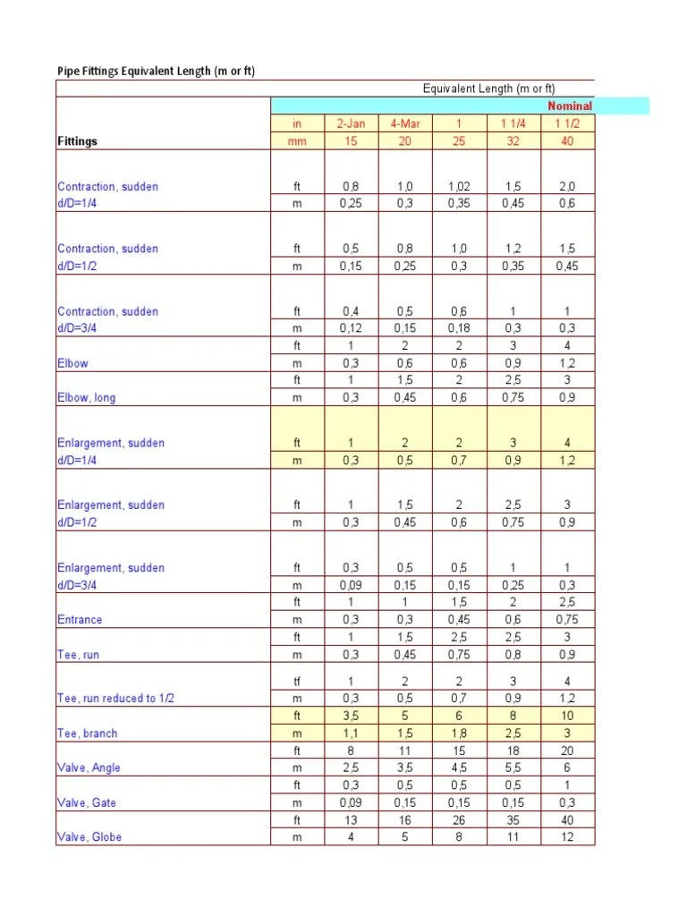 Pipe Fittings Equivalent Length Chart - Equivalent lengths of pipe fittings. Web 36 rows the equivalent length method (l/d ratio) allows the user to describe the pressure drop through a fitting as a length of pipe. Web this page is giving the equivalent length of some common fittings and valves, it can be especially useful for shortcut calculation during preliminary studies. The table can be used for other thermoplastic pipes. Web specific friction loss values or equivalent pipe lengths for alarm valves, dry pipe valves, deluge valves, strainers, backflow. In theory the pressure drop. Web table of equivalent lengths of pipe fittings and valves in plastic (pvc, cpvc, hdpe, grp/frp) and steel pipes Web each section from node to node is calculated by supplying length, volume flow, pipe size, pressure loss from diagrams or tables for the actual pipes and.