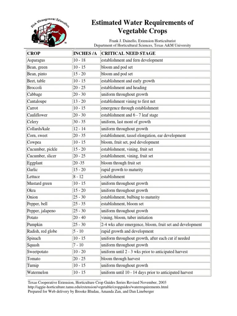 Estimated Water Requirements Vegetable 2012 PDF Crops Food And Drink